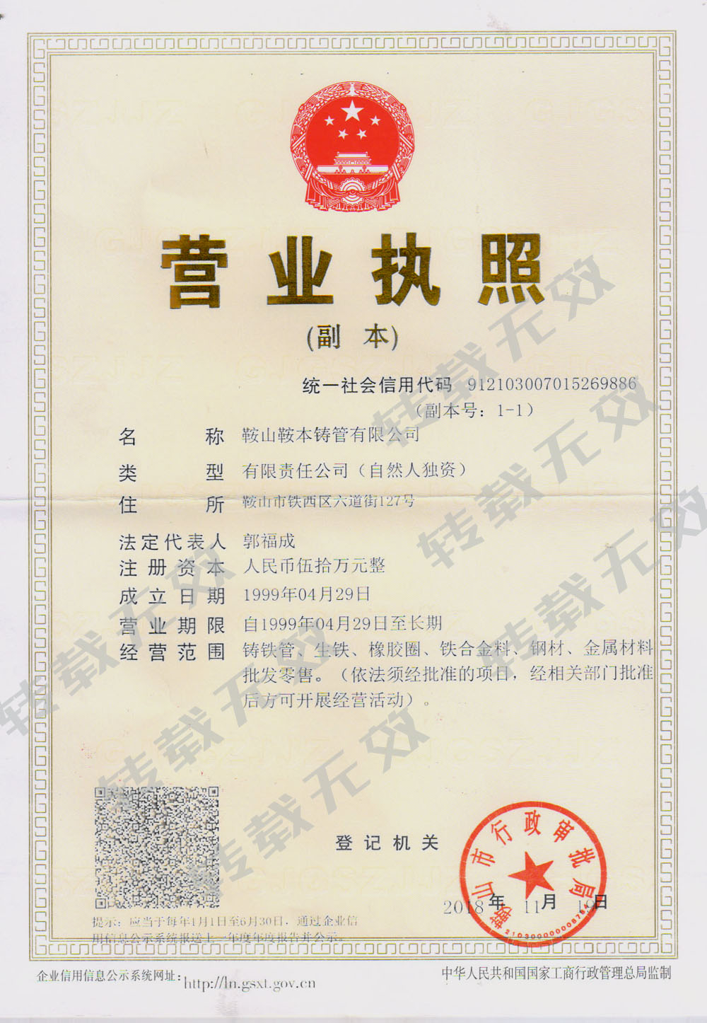 鞍山鞍本鑄管有限公司(原鞍鋼鑄鐵管鐵西經(jīng)銷(xiāo)處)